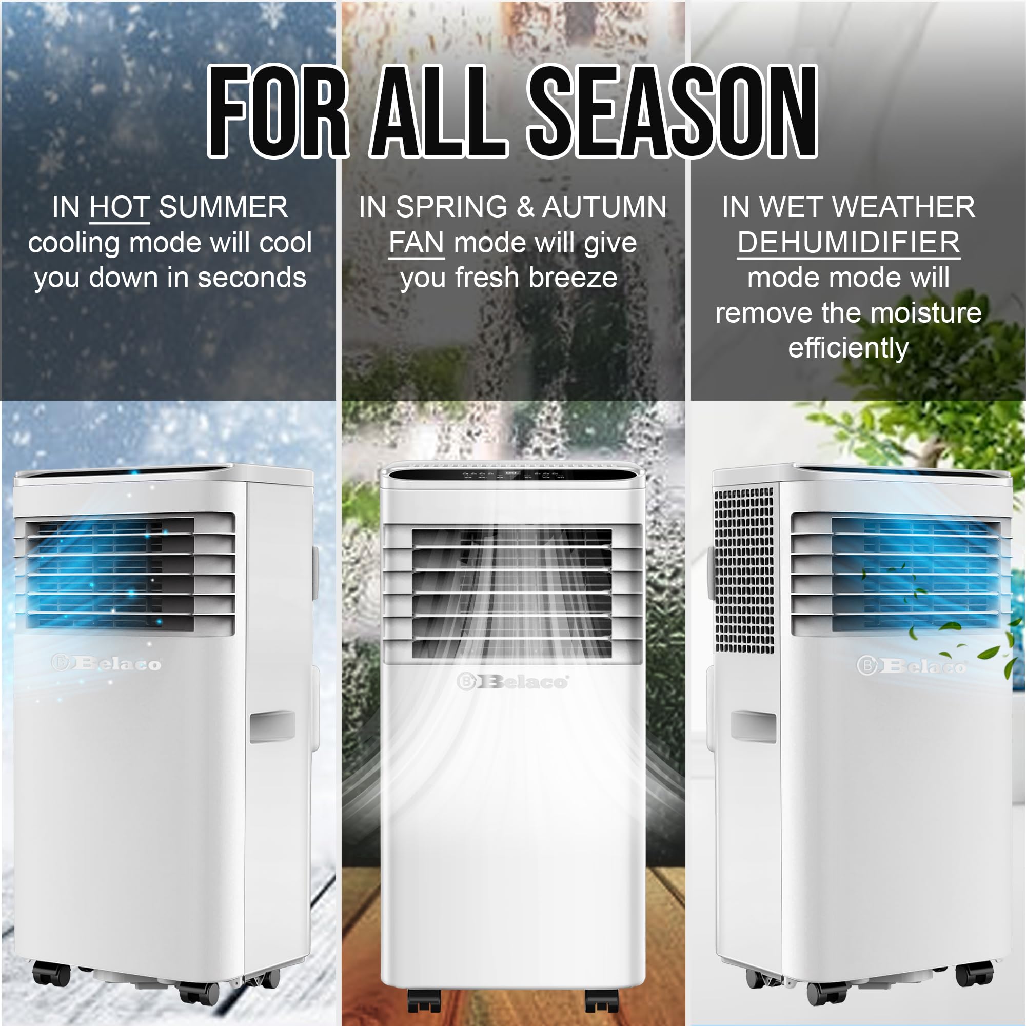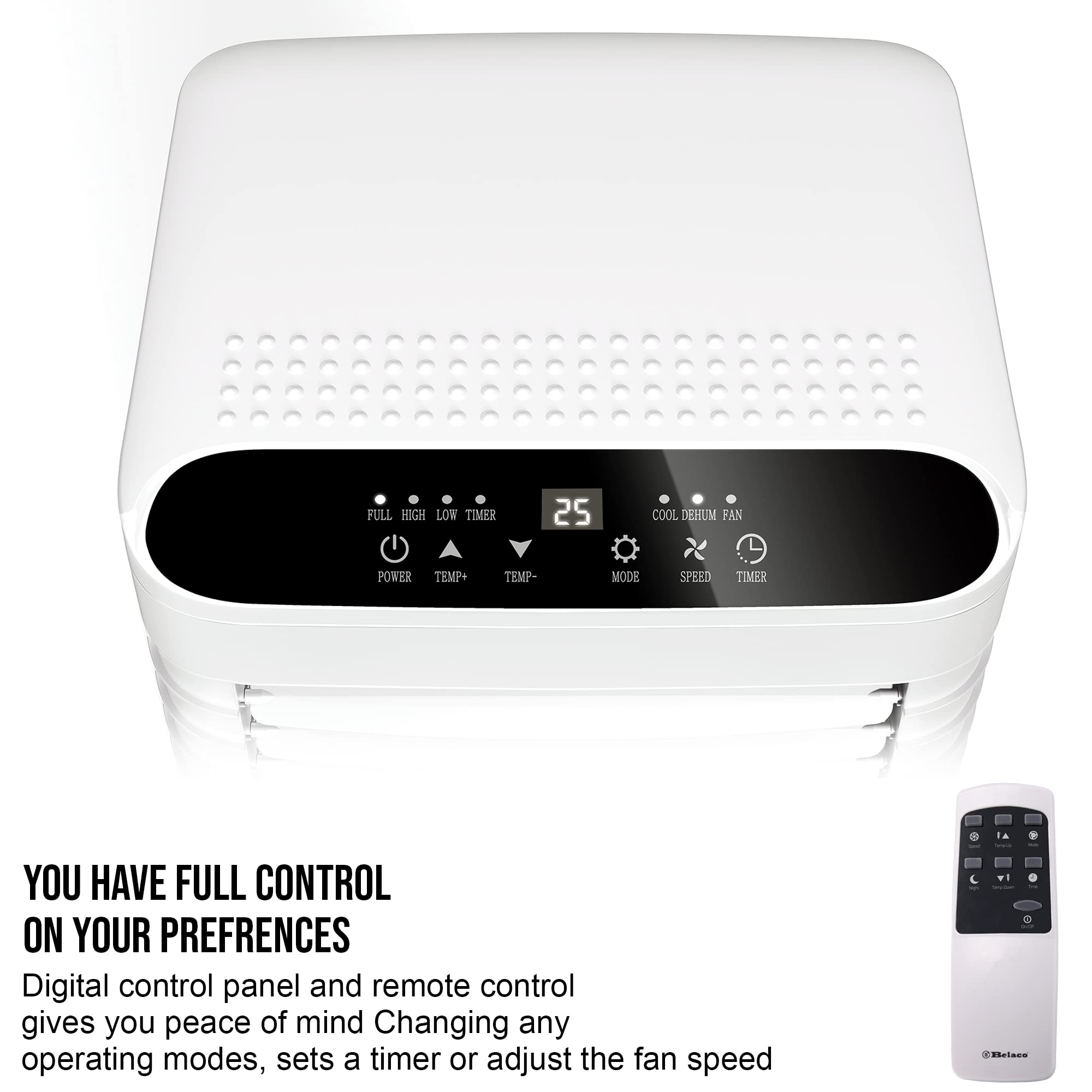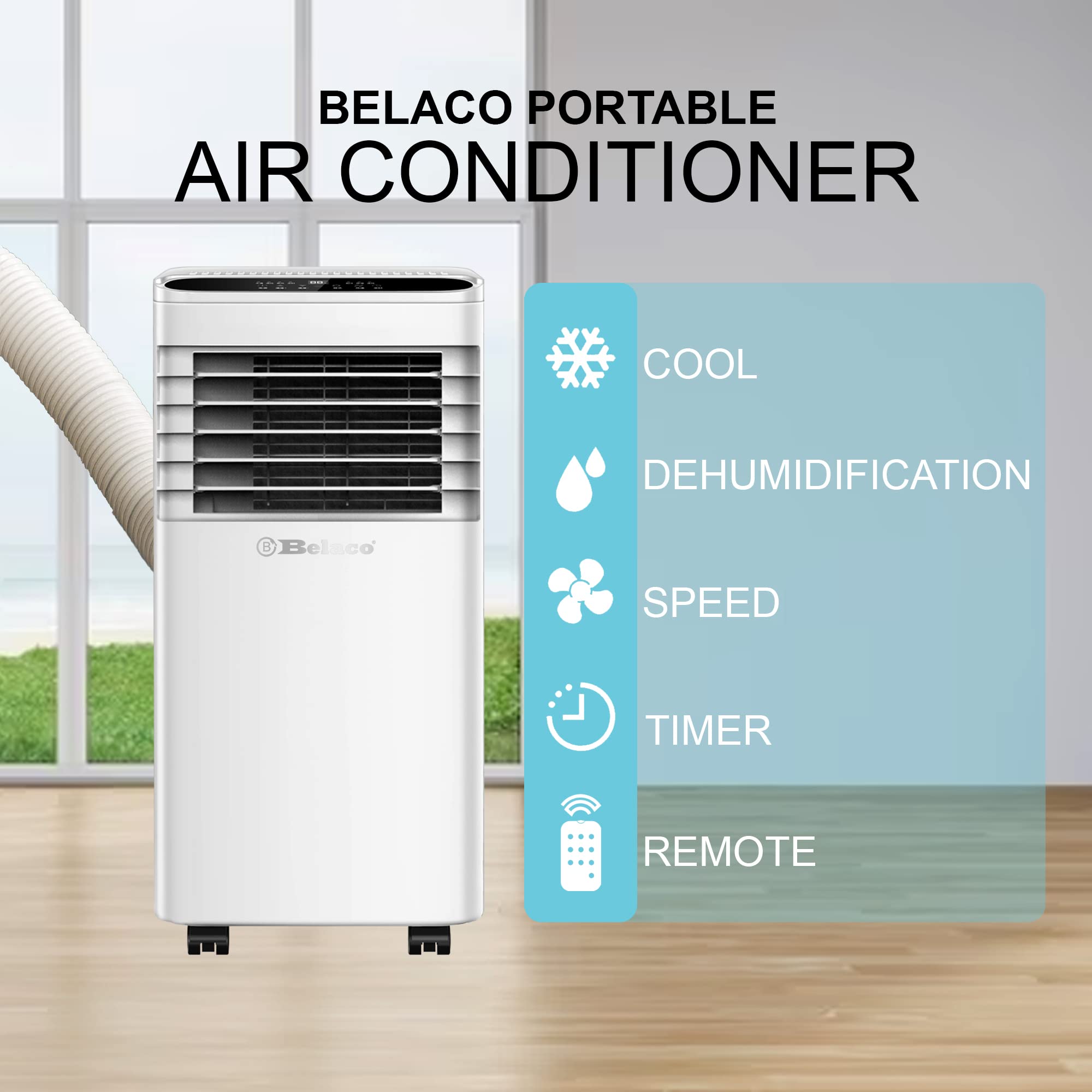 Belaco Portable Air Conditioner, 9000 BTU 4-in-1, Air Conditioning Unit, Fan & Cooling, Dehumidifier, Remote control with 24Hr Timer, Dual Window kit Included with Class A Energy Efficiency Rating