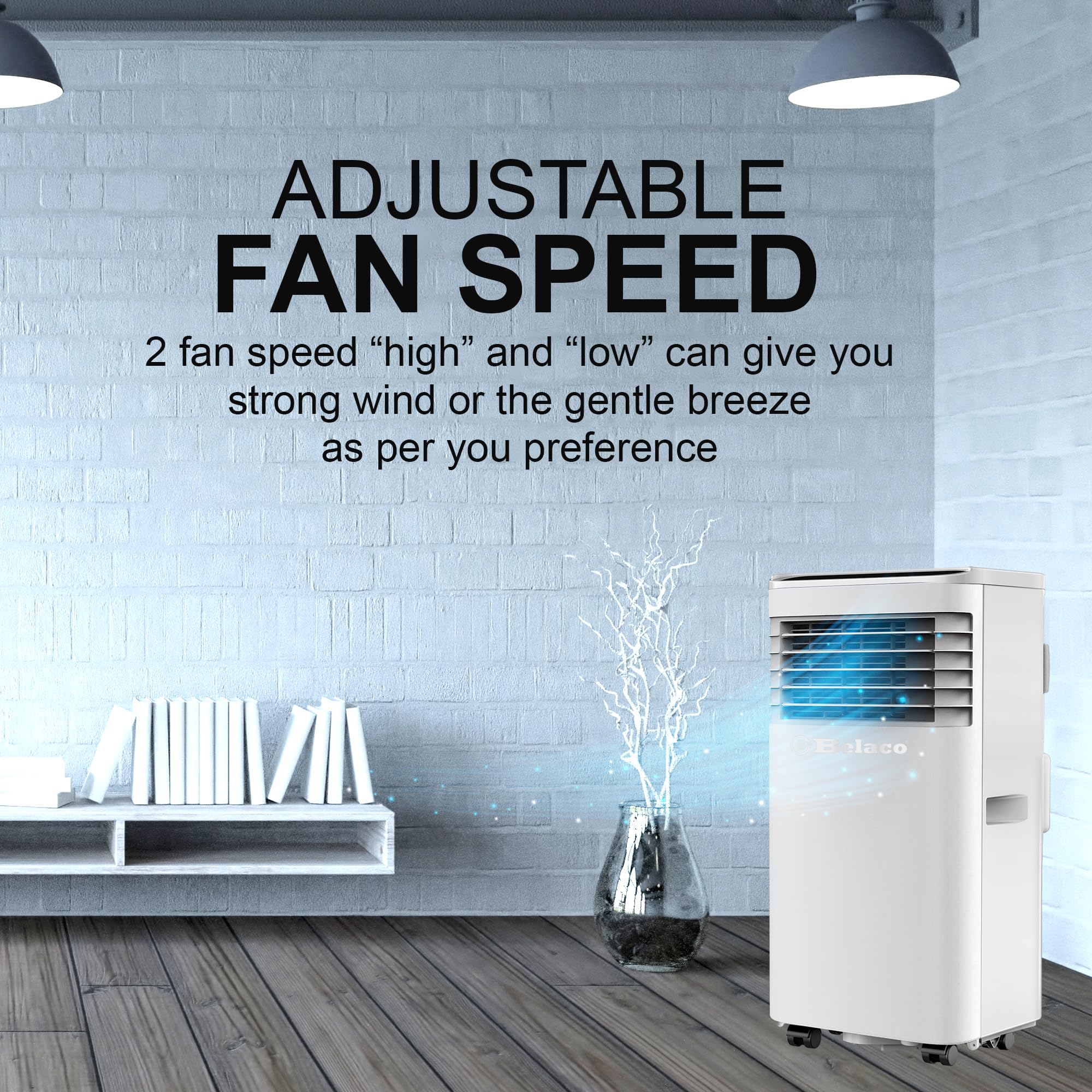 - 【POWERFUL 9000BTU COOLING】 Belaco Air Conditioner of 9,000 BTUs, delivers an immediate cooling in your Home, Bedroom, Cabin, Office, Living Room, Kitchen. The Portable Air Conditioners gives 7000BTU power on speed 1 and 9000BTU power on speed 2 which is ideal for space up to 215 square feet.