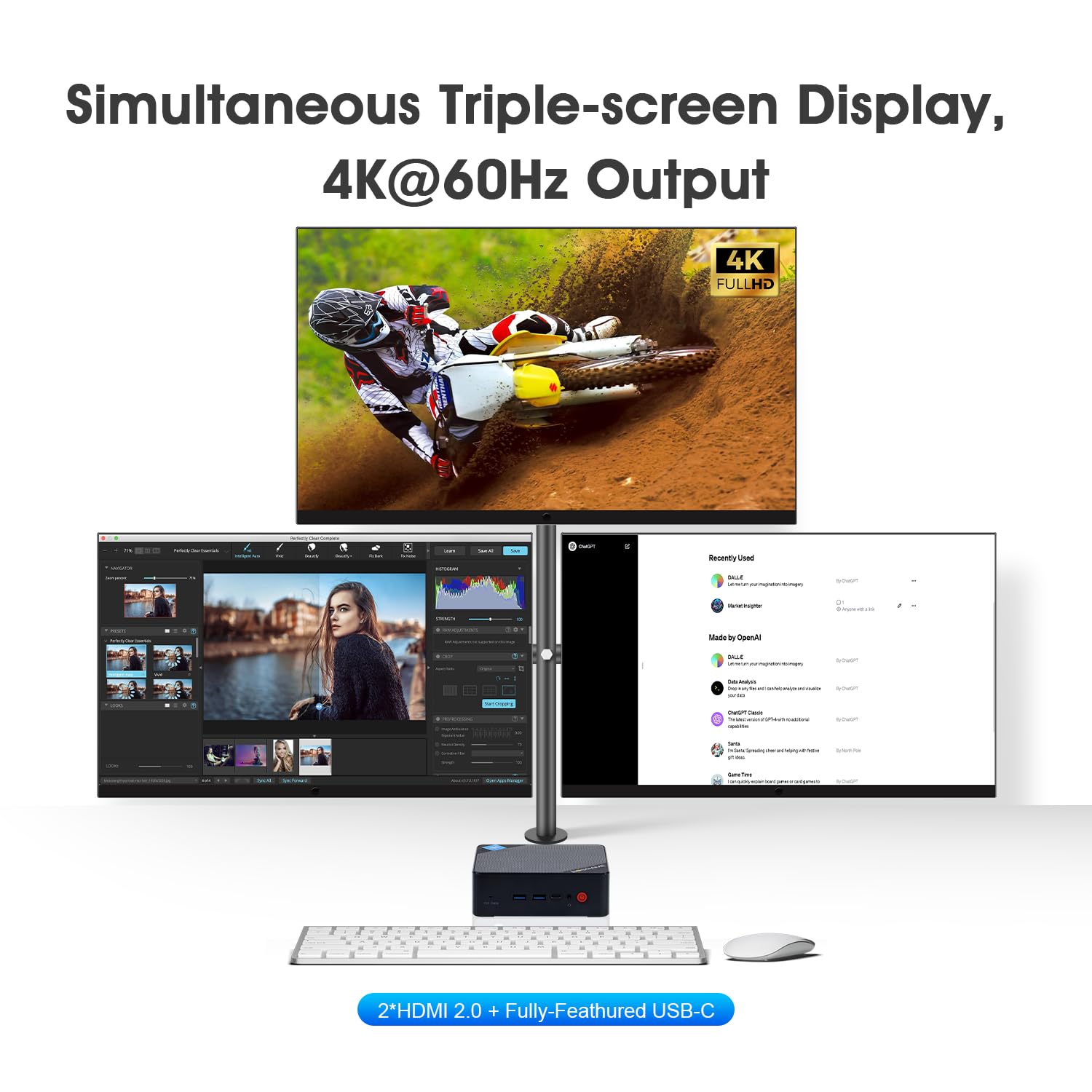 - 🌠【Dual HDMI+USB-C Ports 】The inclusion of dual HDMI ports and a USB-C port in the B100 Windows 11 Pro mini PC, coupled with Intel UHD Graphics support, With the capability to connect two monitors simultaneously through the HDMI ports and an additional monitor through the USB-C port, users can enjoy a triple-screen display configuration.This triple-screen setup enables users to perform different tasks across multiple monitors, enhancing productivity and efficiency by providing more screen real estate to work with.