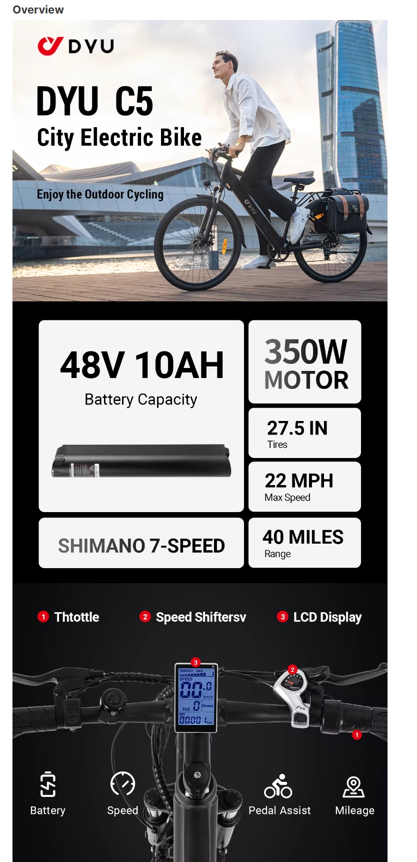 DYU C5 27.5 Inch Integrated battery Electric City Bike road Bicycle EBike Aluminum alloy full suspension electric mountain bike