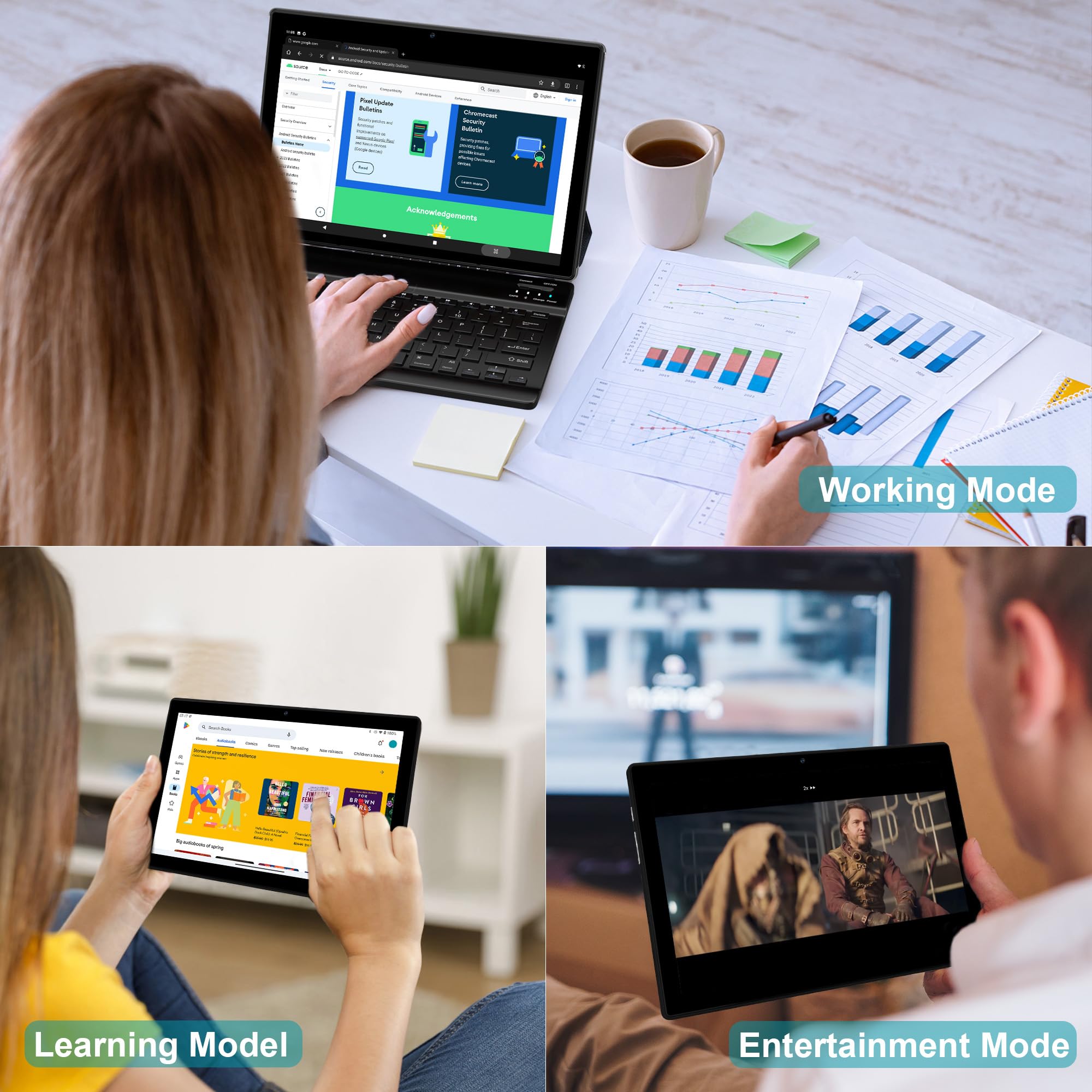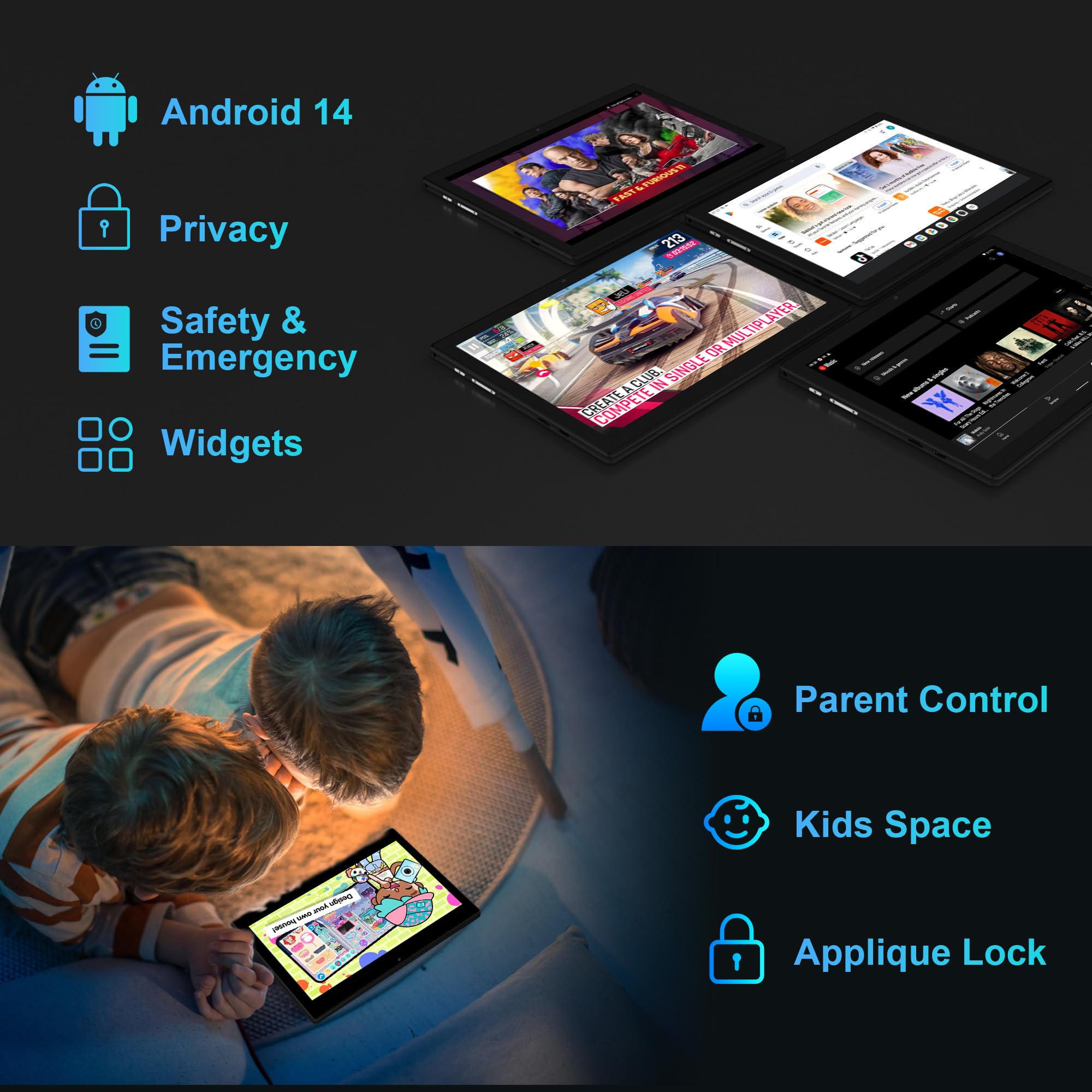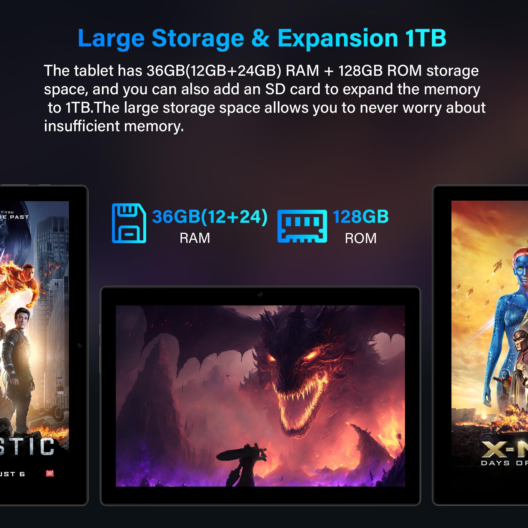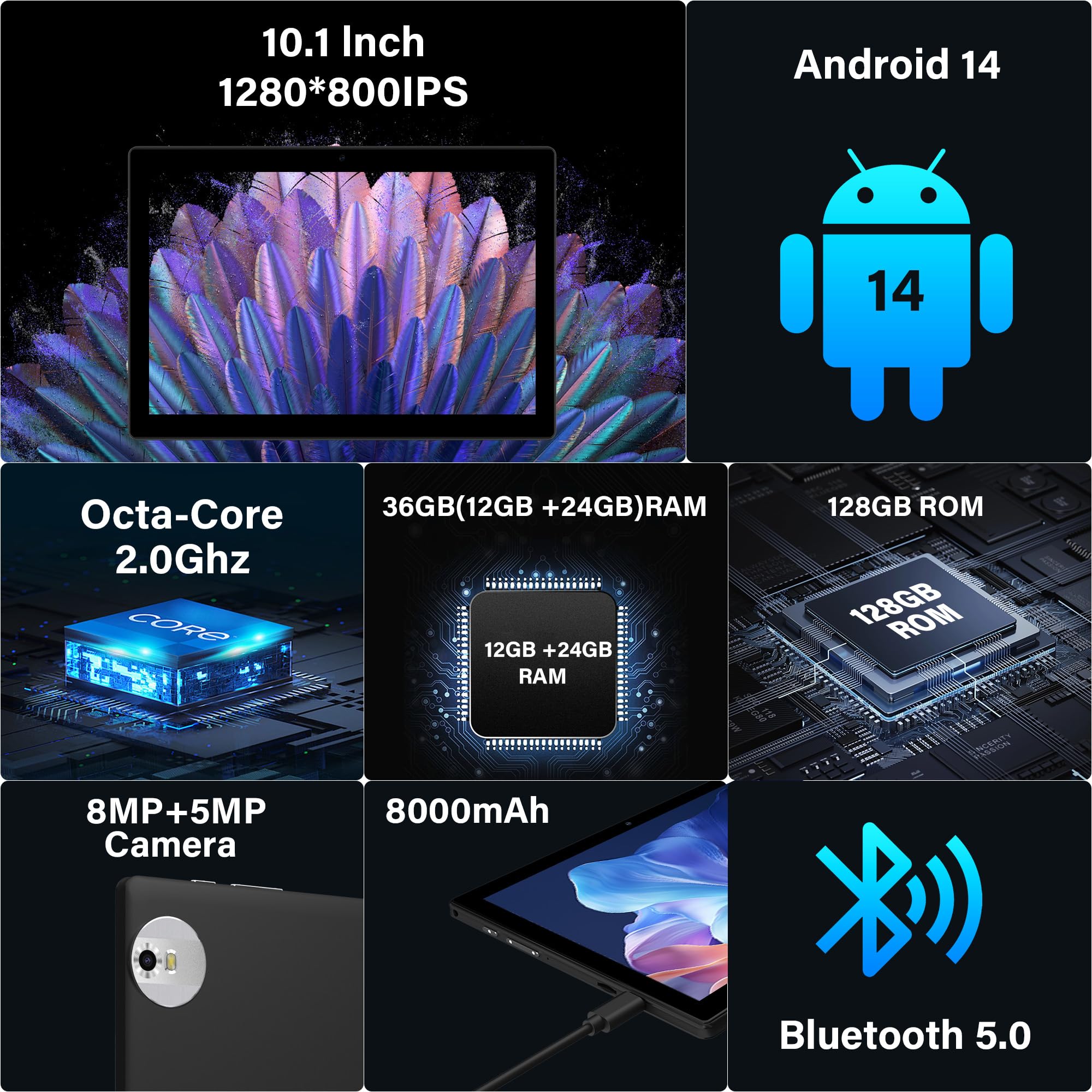 FLYCOAY Tablet 10 Inch Android 14, 5G WIFI 6, 36GB RAM+128GB ROM (TF 1TB), Widevine L1, 8000mAh, Dual Camera, BT5.0,Type C, Tablet with Keyboard, Mouse, Case, Pen-Black