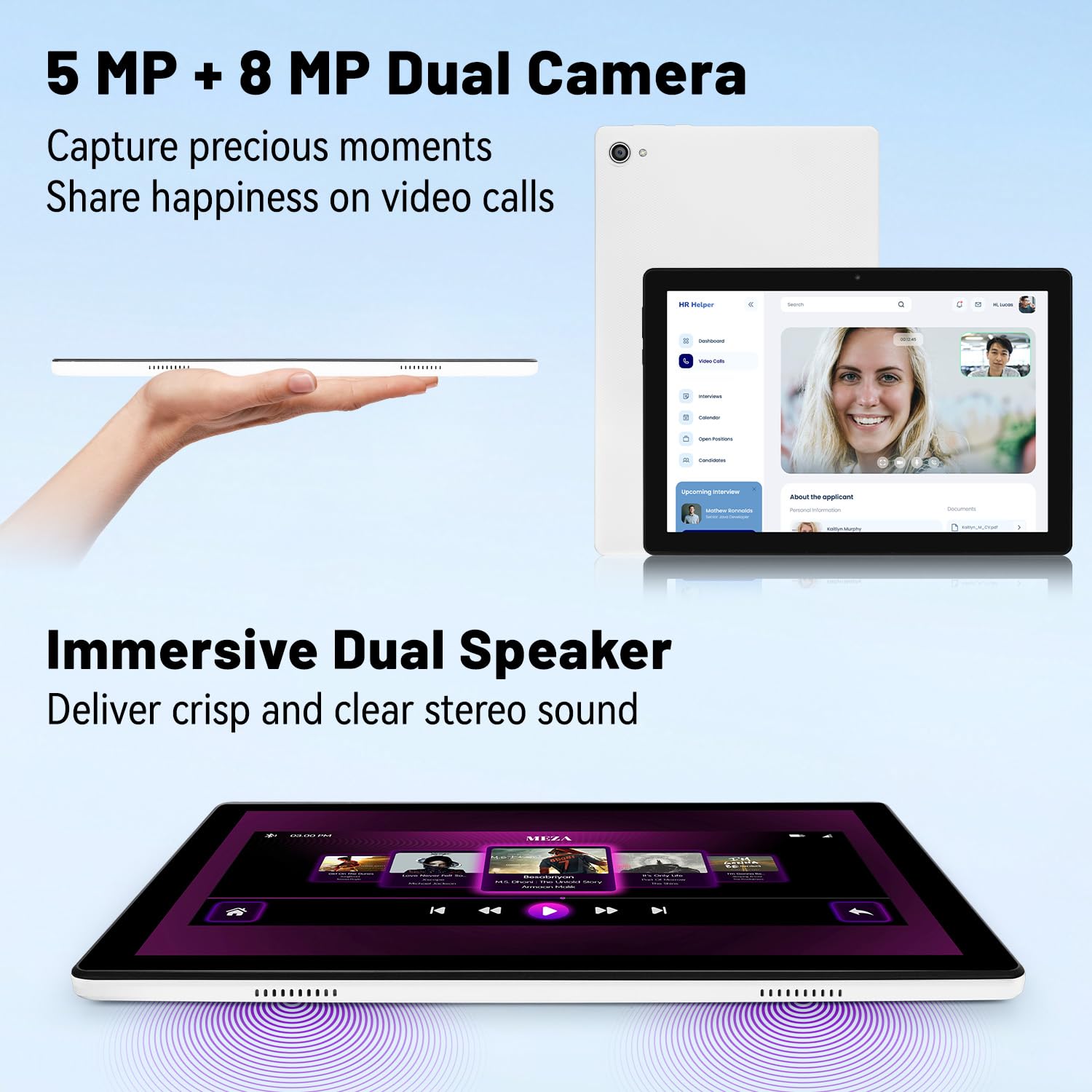- Dual HD Camera + Immersive Stereo Sound: The 1280×800 HD gaming tablet is equipped with a 5 MP front camera and an 8 MP rear camera, perfect for capturing and sharing precious moments during video chats with friends. This 10.1-inch tablet features two outstanding speakers to enhance the audio experience.