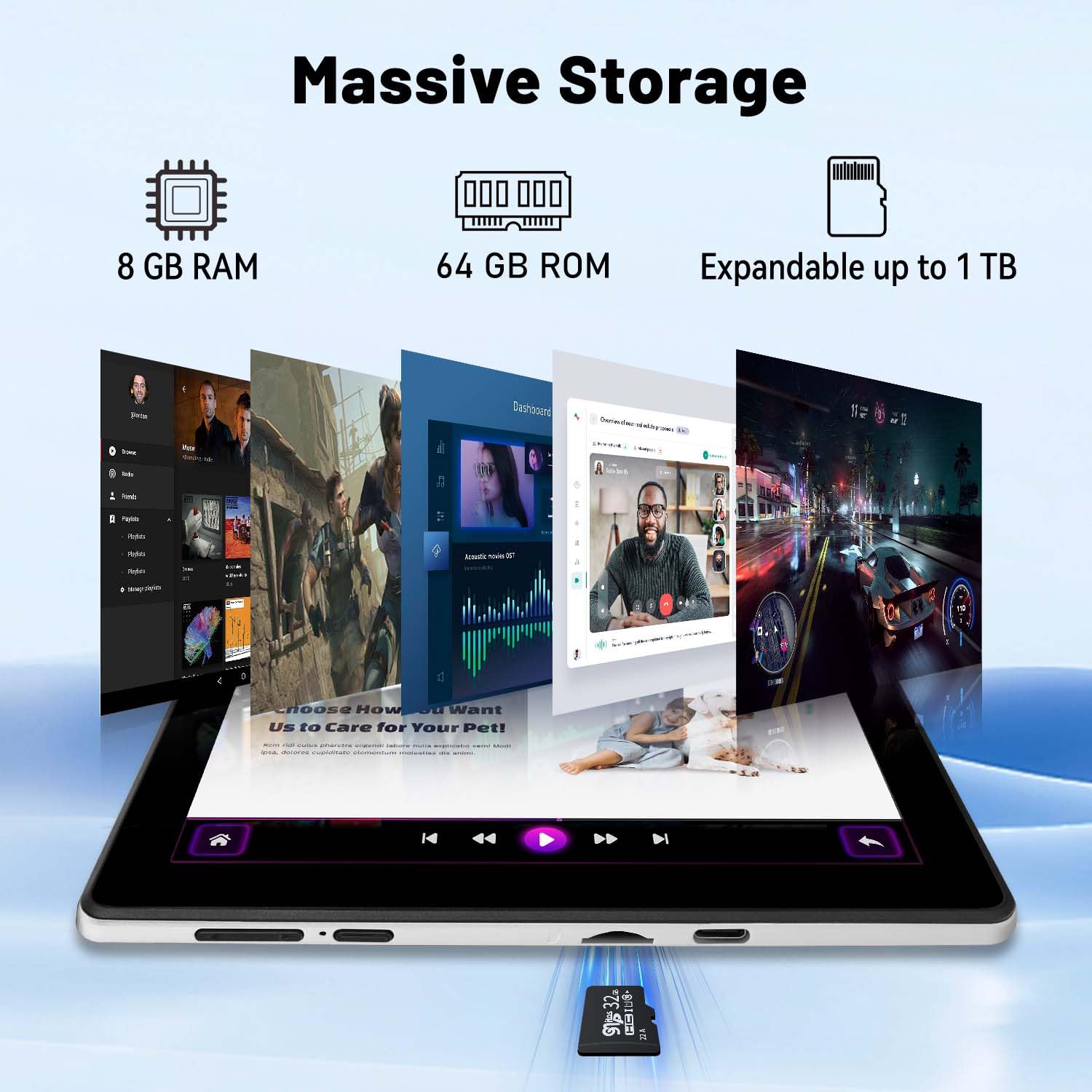 - 8 GB RAM + 64 GB ROM + 1 TB Expandable: The Android 14 tablet comes with 8 GB (3 GB + 5 GB expansion) RAM, 64 GB internal storage, and supports expansion up to 1 TB via TF card (not included), to provide faster streaming options, responsive gaming experiences and multitasking capabilities.