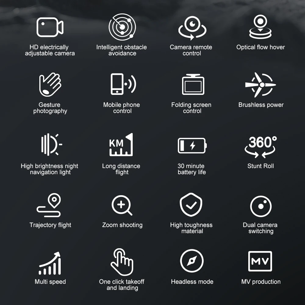 Functions: up/down, forward/backward, left/right turn, lateral flight, headless mode, optical flow positioning hovering, electric dual camera, four-sided obstacle avoidance, 360-degree roll, altitude hold mode, WiFi FPV, with screen control remote control, fuselage power display