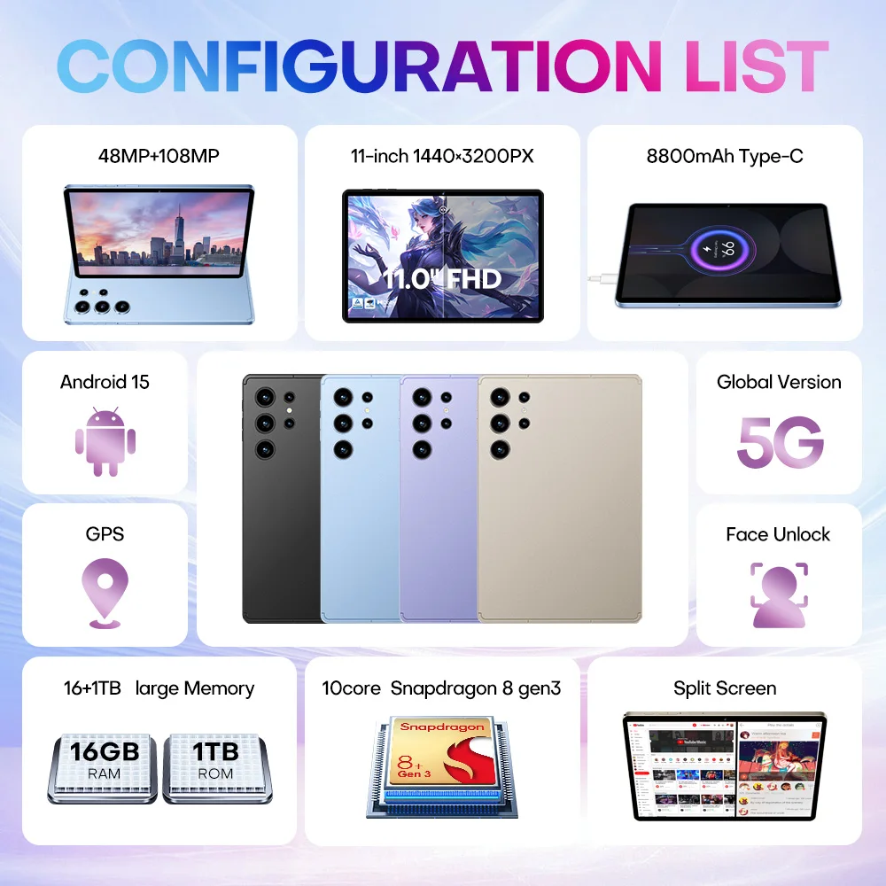 Pad9 Pro 11 Inch Tablet with 4G/5G Full Network Quad Core MTK Processor 16GB+1TB Large Storage Capacitive Screen Wi-Fi GSM