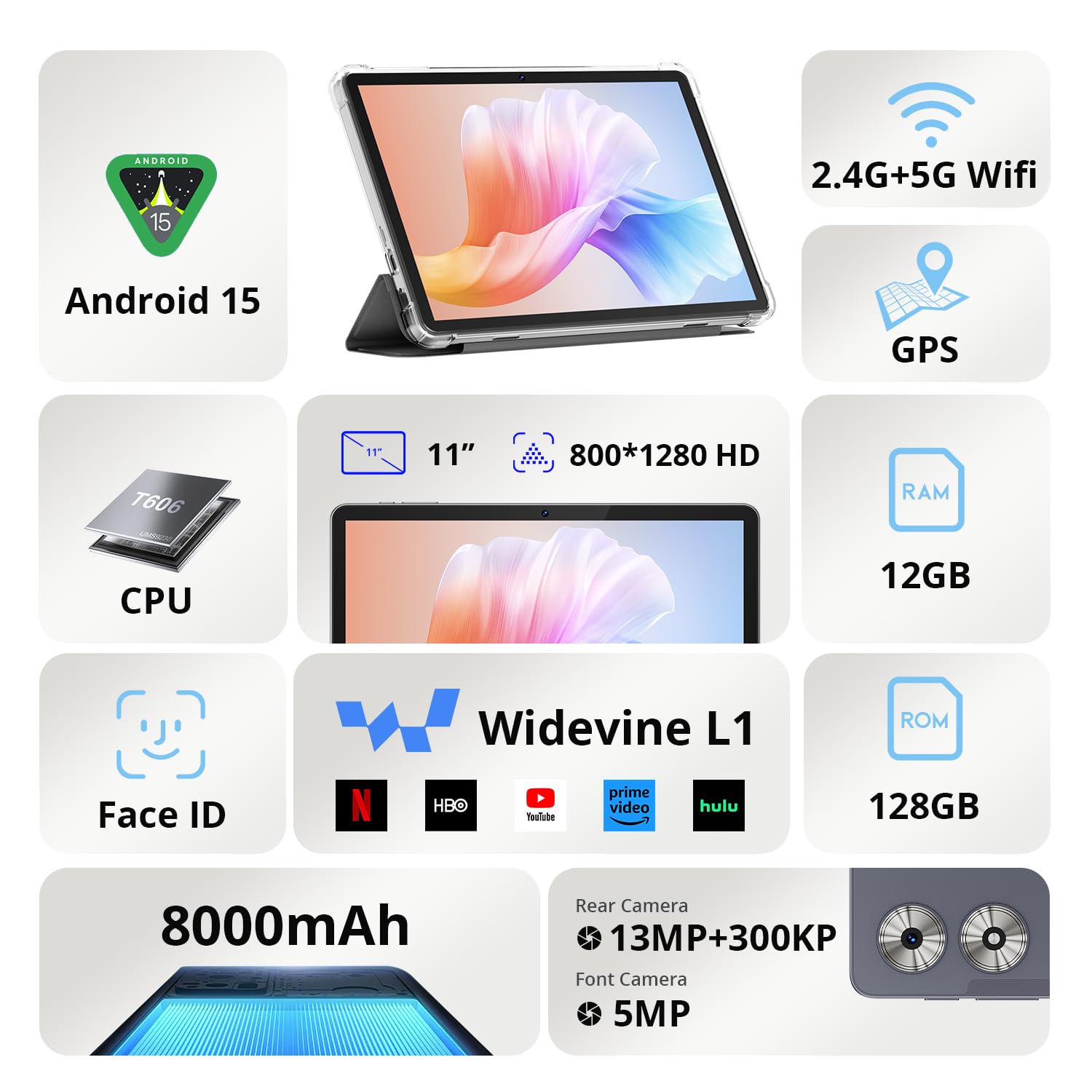 Tablet, Android 15, 11 inch Tablet with Case | T606 Octa-Core | 1280×800 HD IPS Screen | 8000mAh(with NTC)| 2.4G+5G WiFi | BT5.0 | GPS | Widevine L1 | with Usb Ports (Gray)